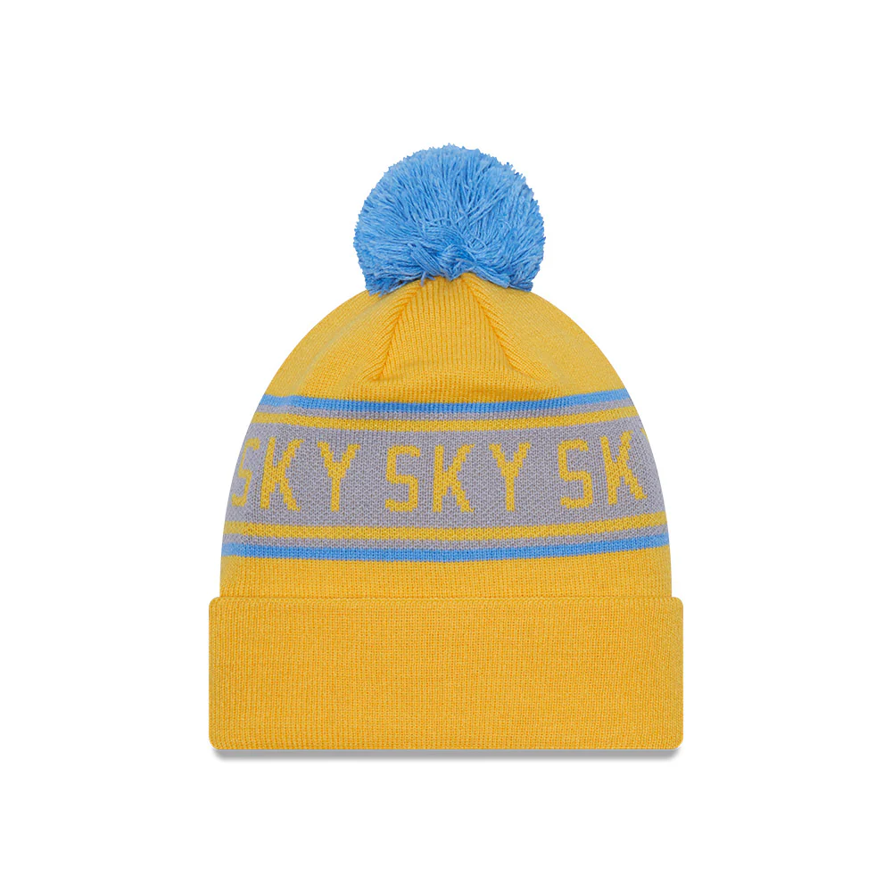 Stay cozy during the colder months with this Chicago Sky Knit Repeat Game Day Hat. The Hat is yellow with a blue pom on top. The Sky logo is heat pressed onto the cuffed front. There are blue stripes all around the hat with the lettering Sky repeating all over it. Get yours today at Clark Street Sports!